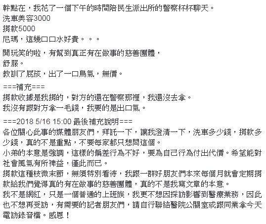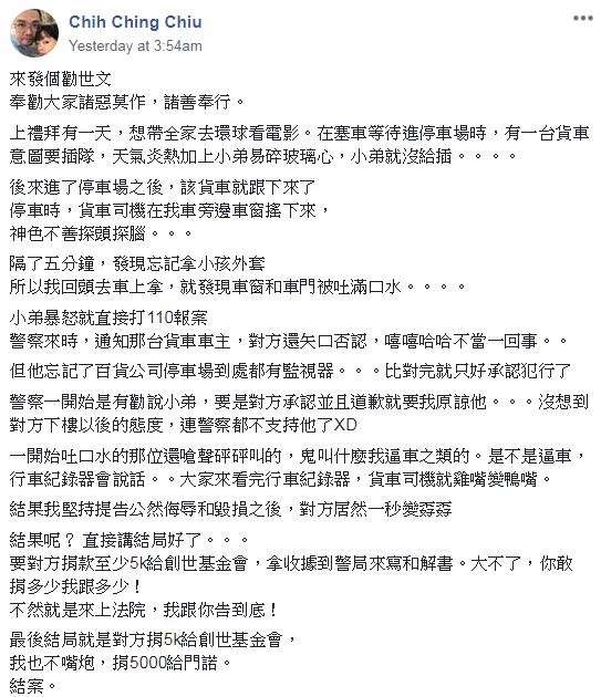 ▼後來吐口水的司機又開始發難,鬼叫說是原po逼車才會這樣做。可是在原po拿出行車記錄器打臉他之後,他也就不敢再出聲了。後來原po堅持提告公然侮辱和毀損,對方竟然馬上變孬開始求饒了。最後原po要求對方捐款至少5k給創世基金會,拿收據到警局來寫和解書,對方捐多少自己就捐多少,不同意就是法院見!最後對方捐了5000塊給創世基金會,而原po也不食言的捐了5000。最後原po也開玩笑表示,因為幾口口水,他花了一個下午的時間在民生派出所,還花了3000去汽車美容加上捐款的5000塊,真的好貴啊!