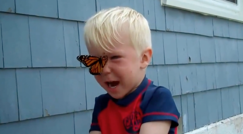 ▼只見影片中的蝴蝶飛到小男孩的臉上,他一開始很害怕,可是他盡力保持冷靜,直到蝴蝶自行飛走。之後還自嘲蝴蝶飛到他的鼻子上和額頭上,十分可愛。