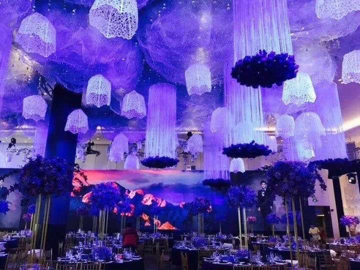 ▼從網路上曝光的照片可以看出,整個婚禮現場利用燈光打造了超夢幻的效果,如果《阿凡達》中那種令人眼花繚亂的景色真的會令人驚歎不已,不愧是花了7000萬打造出來的場景!
