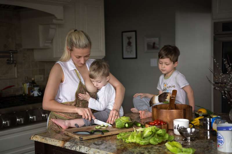 ▼一隻手抱住孩子餵奶,還要一邊做飯。