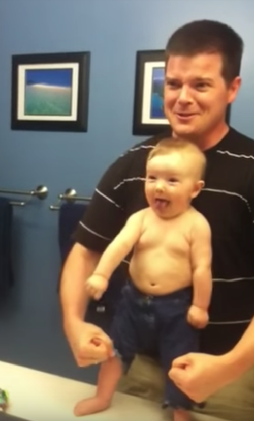 ▼爸爸一擺出肌肉動作,寶寶就要模仿,還笑得超開心!