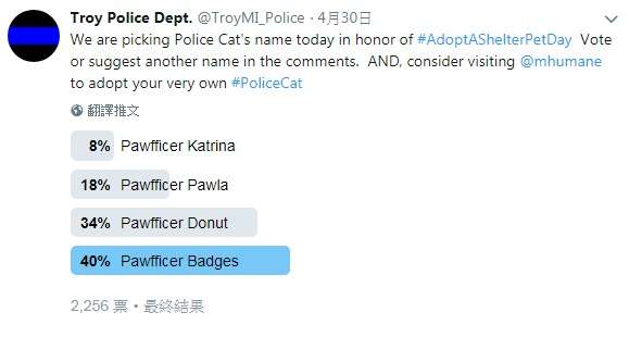 ▼讓人驚訝的是在短短8天內特洛伊警局的推特粉絲就從4千人上升到1萬人,警局也決定實現諾言去收養中心挑選「貓警官」。警局還在推特上呼籲大家一起投票選出新任「貓警官」的名字,這樣超甜蜜的互動很快吸引了大家的注意,「警徽」成為最受歡迎的名字。