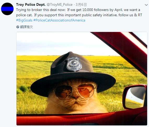 2018年05月23日喵星人不僅僅是傲嬌的「主子」,還是真正的「萬人迷」。位於美國密歇根州底特律郊區的特洛伊(Troy)警局為了方便傳遞民眾訊息想要增加推特的粉絲,最終他們請來了喵星人幫忙。