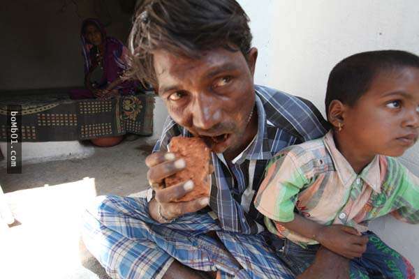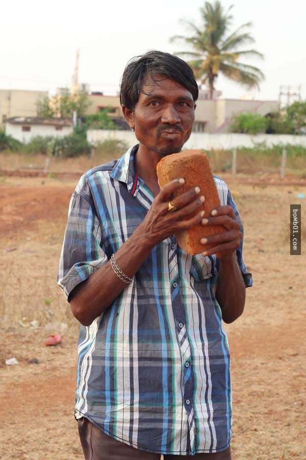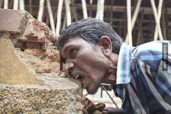▼現在,Pakkirappa試圖通過展示他這種特別的技能,以賺取外快。神奇的是,他吃磚頭時並沒有損害到他的牙齒。