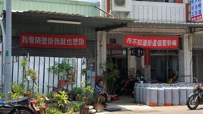 難道掛這樣的紅布條,是3間店老闆的默契?其實這都是瓦斯行老闆的兒子閻先生掛的。