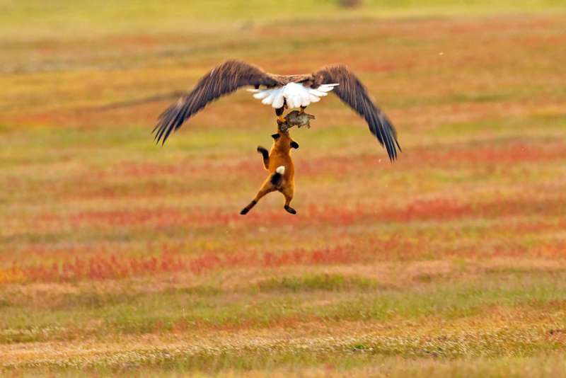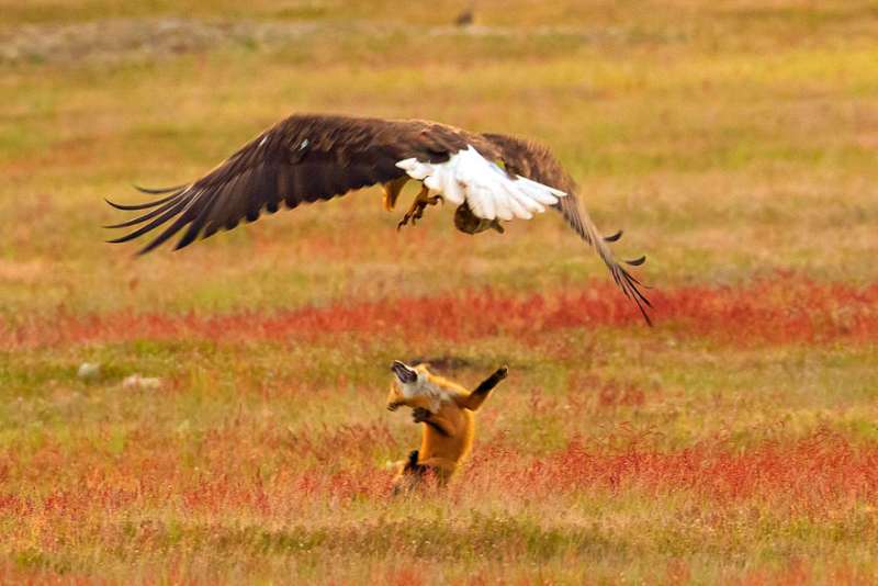 大自然中的生存競爭太激烈了,狐狸在空中與白頭鷹爭鬥的瞬間超珍貴,這樣的畫面值得珍藏。