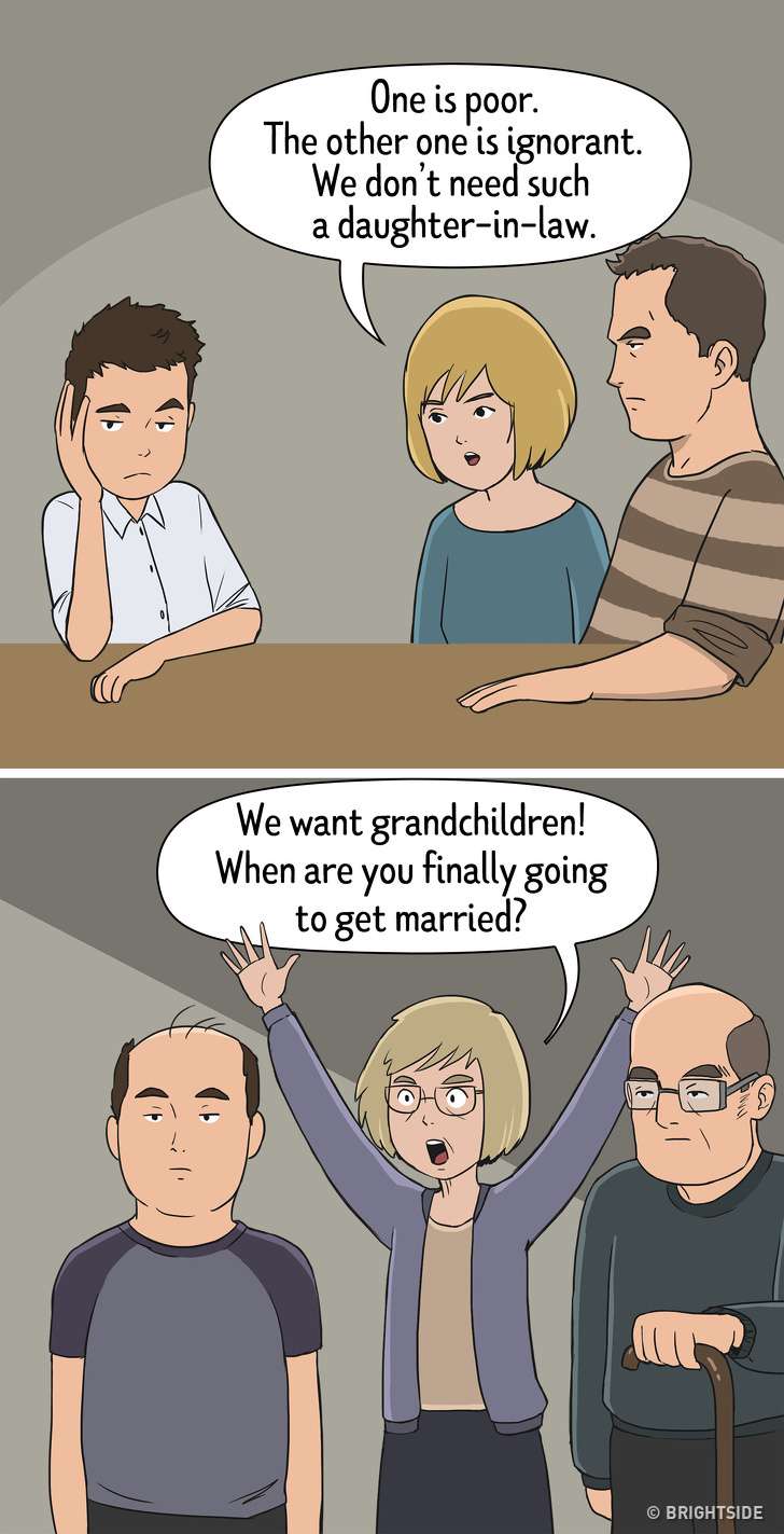 「那個太窮了,另一個太笨,我們不需要這樣的媳婦。」「我們想抱孫子孫女!你打算什麼時候結婚?」