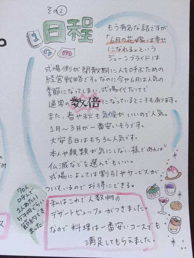 不要追求「當6月新娘會幸福」或者特定的吉日,很多人選擇天氣宜人的春天和秋天,但實際上淡季舉辦婚禮可以省下好幾倍的婚宴場的費用,據說1月到3月是最便宜的。