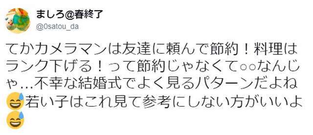 ▼「朋友當攝影師未免也太降低等級了吧,這些方法不是省錢而是小氣,簡直是不幸的婚禮模式,年輕人還是不要學比較好!」