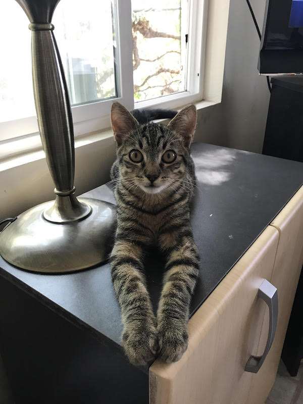 ▼網友疲憊地下班回家,看到的就是這隻小虎斑貓,牠正趴在牠家放鬆,表情還一臉無辜,「牠一定是從打開的窗戶進來的,我根本沒養貓!」