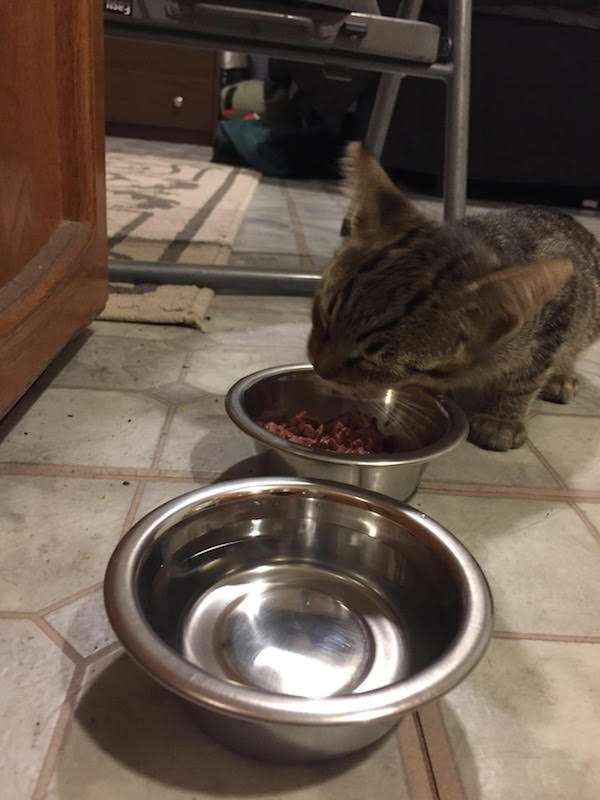 ▼這隻小貓身上沒有項圈,還拼命喵喵叫,被欽點的剷屎官只好認命跑到附近的商店,買了一些貓咪用品和貓糧,果然小虎斑貓一看到就開始大快朵頤。