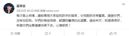 ▼年近40時,黃坤玄也曾在微博表示,每次都有人記得他、給他留言,讓他覺得很溫馨,「這些年來,我過得很好,希望你們也要健康快樂下去,心懷感恩!」網友也驚喜回應:「哈哈,我覺得今年肯定還會更新的」、「過得好就行,我們也只是希望你能好好的」、「永遠的波仔。」