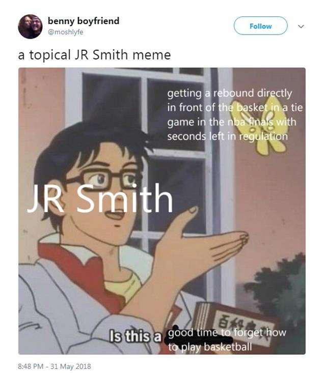 2018年06月02日美國NBA總決賽首場賽事戰況激烈,勇士隊與騎士隊數度進入拉鋸戰,不過就在最後關頭,搶得籃板的JR史密斯(JR Smith)卻放棄上籃,讓勇士隊在加時賽獲勝。觀眾紛紛對於JR史密斯的動作感到不解,更爆發改圖大戰!