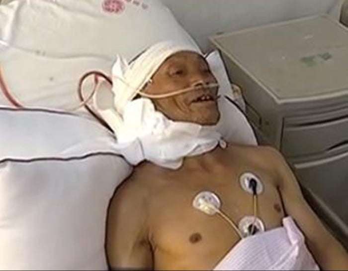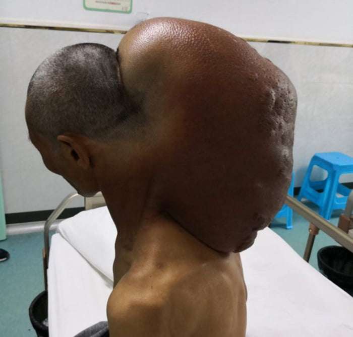▼趙老伯家經濟條件不好,一直沒有接受治療,但頭頸托著15公斤的重量,真的太吃力了。眼看腫瘤越變越大,孩子們擔心他受不了,這才籌錢帶他去看病。醫生看到後驚呼:「我工作這麼多年,從來沒見過這麼大的腫瘤!」