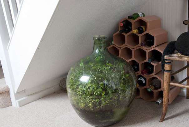 實際上瓶內已經形成了一個自給自足的生態系統,雖然玻璃瓶密封,但是瓶內的植物依然可以進行光合作用,最開始倒入瓶內的水提供了必要的養分,陽光照耀水蒸發到空氣中後,冷凝在瓶壁上再次回到根部,脫落的枝葉通過土壤中的細菌分解,釋放出滋養植物的二氧化碳。
