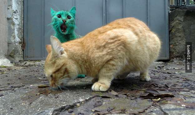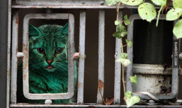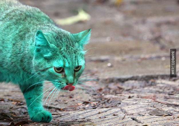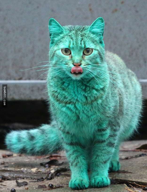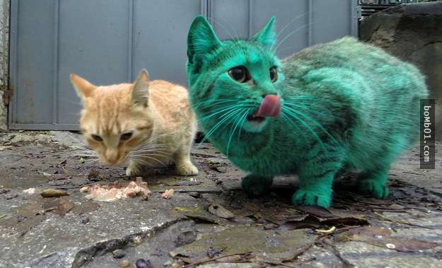 人們說牠身上的顏色一天比一天綠,與其他的貓完全不同,當然,世界上哪還會有這種顏色的貓咪呢?雖然暫時看不出這些顏料對牠的危害,但還是希望牠能快點洗掉,恢復自己本來的樣子,否則總是讓人很擔心。