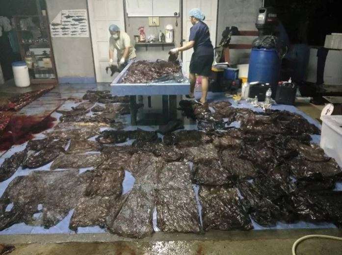 ▼泰國農業大學海洋生物學家席恩指出,鯨魚胃中有那麼多塑膠袋,會導致牠根本無法吃下任何有營養的食物,最後才會得重病而死亡,「如果你的胃裡有80個塑膠袋,你一定也會死。」