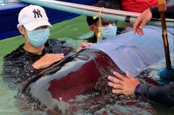 ▼研究人員在搶救鯨魚時,發現鯨魚體內的血糖含量很低,有疑似細菌性肺炎引起的症狀,身體虛弱得無法游泳,需讓研究人員用工具將牠撐起了以免沉進水裡。