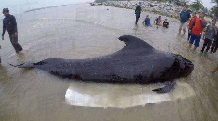 ▼日前有一隻年幼的短肢領航鯨被發現擱淺在泰國南部的安達曼海域,雖然泰國的研究人員經過多日的搶救,最後鯨魚仍然不治身亡。