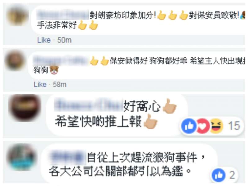 ▼隨後保全的感人事蹟被PO到網路上,短短一個小時就收穫了2000個讚和170多次分享,還有100多條留言。網友們紛紛表示:「非常好,圍欄既可以防止顧客投訴又可以保護狗狗」、「有人情味」、「沒有趕出去真好」,還有網友表示沒有像荃灣商業大廈保全那樣把狗狗趕出去真的很有愛。