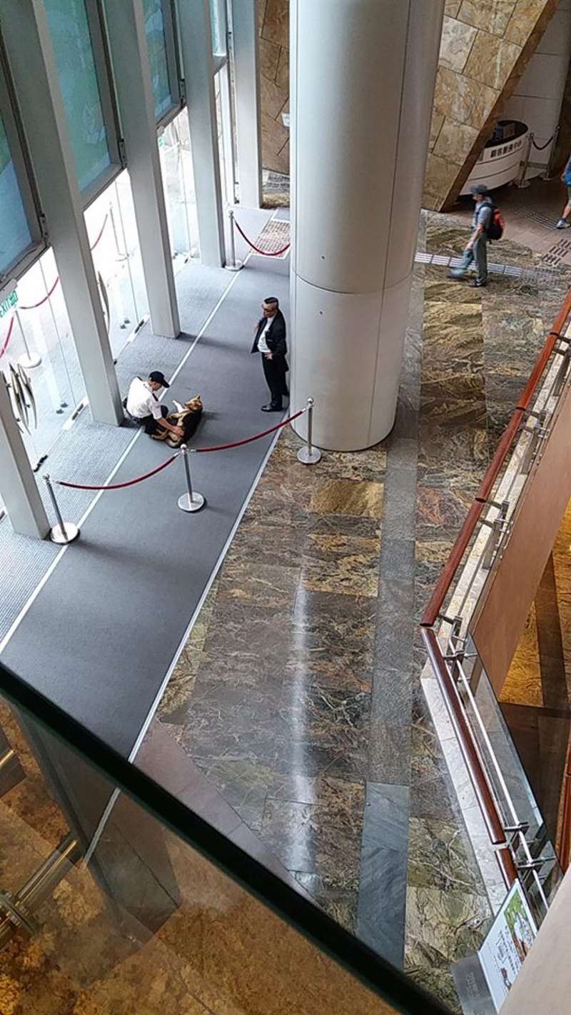 ▼善良的保全為了讓狗狗不受傷害還特別用圍欄隔離牠和顧客,然後又拿來食物和水給牠。