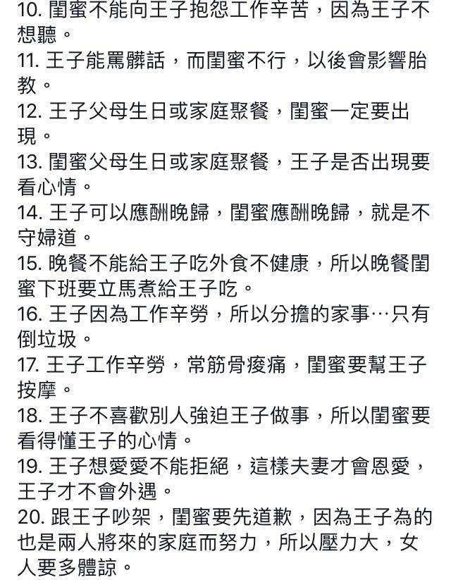 2018年06月11日情侶們從戀愛到結婚要經歷各種磨合,接受彼此的性格特點和生活方式。最近一位網友在臉書社團「王子與公主病」發文挖苦,自己的閨蜜和未婚夫馬上就要步入婚姻的殿堂,但搬進閨蜜家同住的男子竟然列出了驚人的「20項家規」,閨蜜最終選擇分手!
