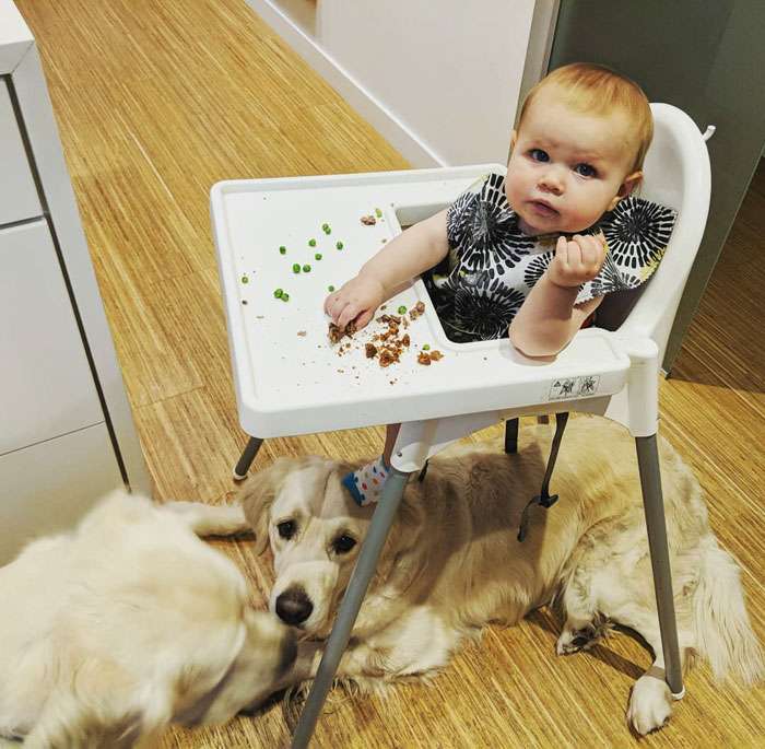 ▼原因是克蘿伊最近剛學會自己吃飯,但她每次都會「無私」地分享給她的毛茸茸朋友,把零食丟出去,布魯和科比就會在下面大快朵頤!