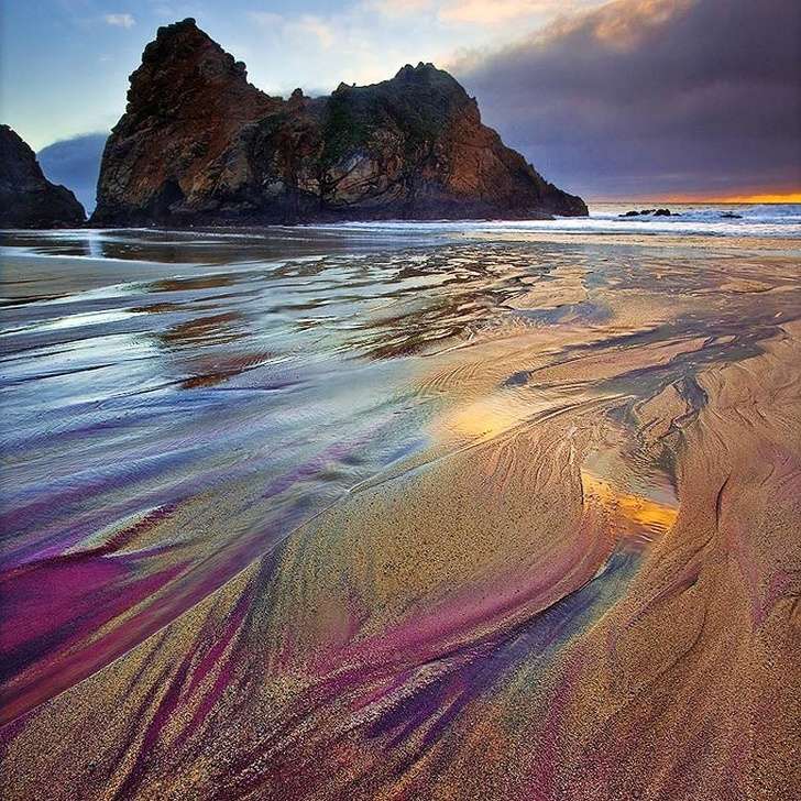 ▼美國加州普法紫色沙灘。周圍山丘上的錳石榴石被衝進海水中,最終堆積到沙灘上形成一片片紫色,讓整座沙灘更加迷人。