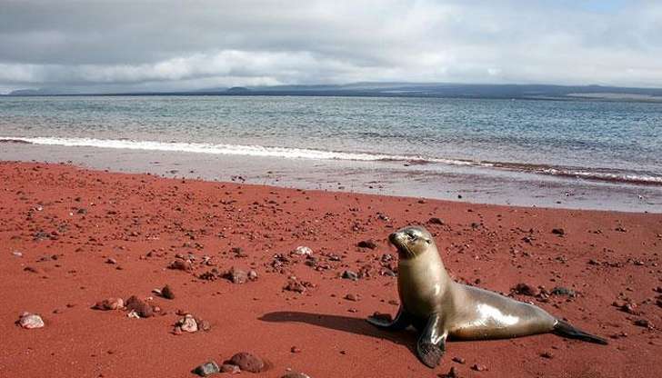 ▼加拉帕戈斯群島的紅色沙灘。這篇紅色的沙灘是由富含鐵的熔岩沉積物氧化形成,絢麗的顏色讓整座海灘與眾不同,更有趣的是在這裡邂逅小海豹。