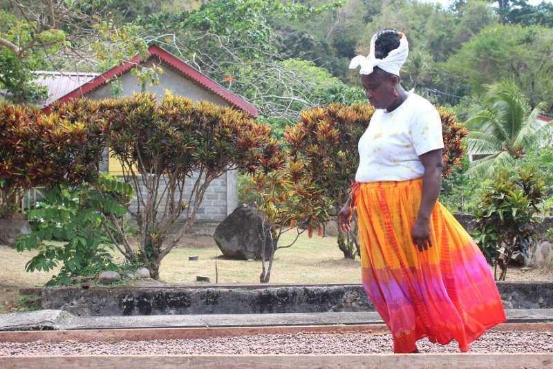 ▼發酵後的可可豆在陽光下曬乾,大約要經過7~10天的時間。在這段時間裡工人們要不斷的翻動可可豆確保它們被均勻的曬乾。