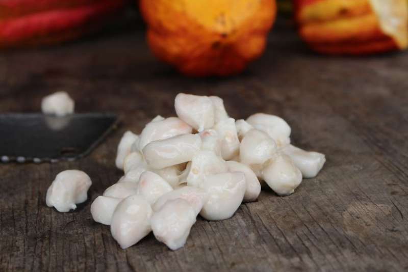 ▼每個豆莢裡都有白色的果肉,包裹著25~40顆可可豆。