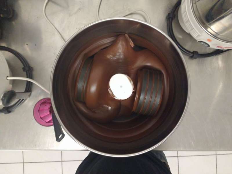 ▼調製好的巧克力漿放置在容器中晾乾,3天後形成最終的巧克力。