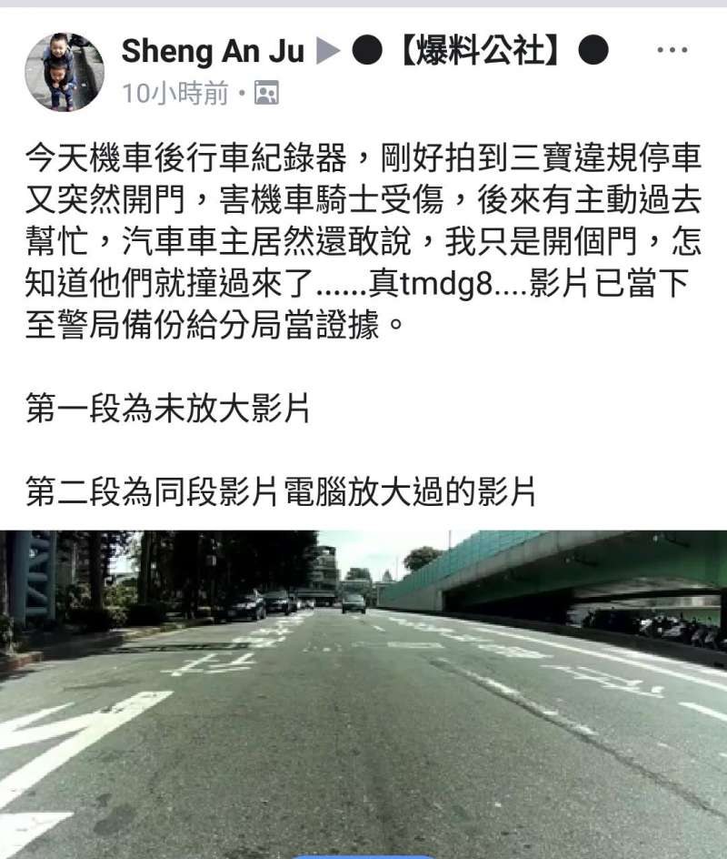 ▼日前網友Sheng An Ju在爆料公社發文表示,他的機車後行車記錄器拍到了這驚悚的一幕,事後他主動過去幫忙,汽車駕駛竟然還說「只是開個車門,怎麼知道他們就撞上來了」,讓他非常生氣,直接將影片備份到警局當證據。