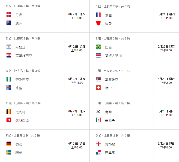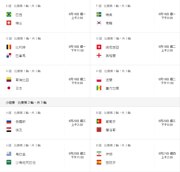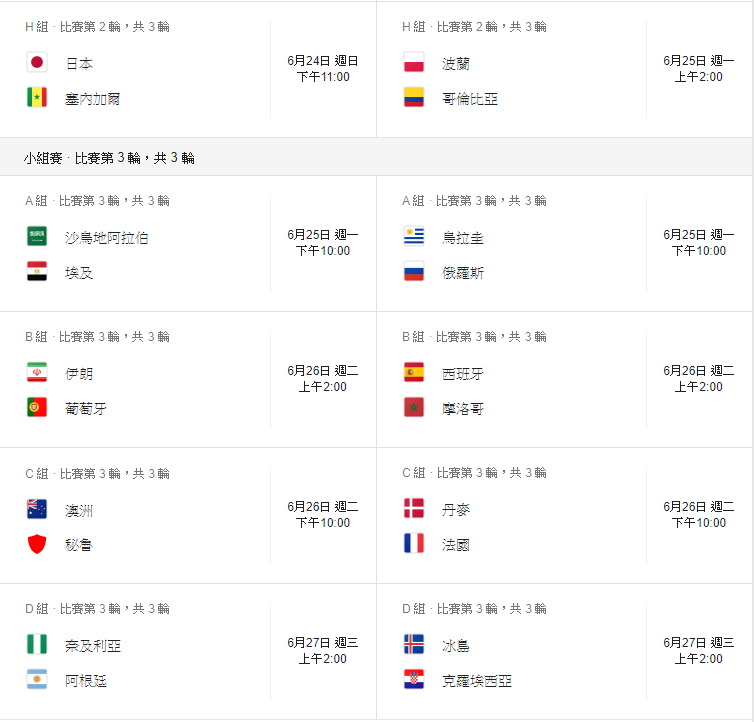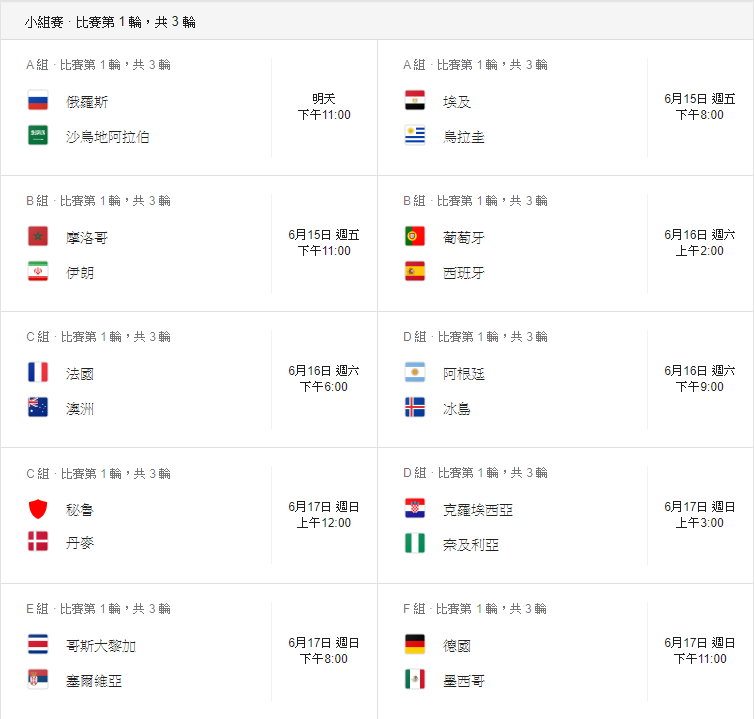 ▼2018世界盃足球賽-小組分組表(以下所有時間皆以台灣為準)