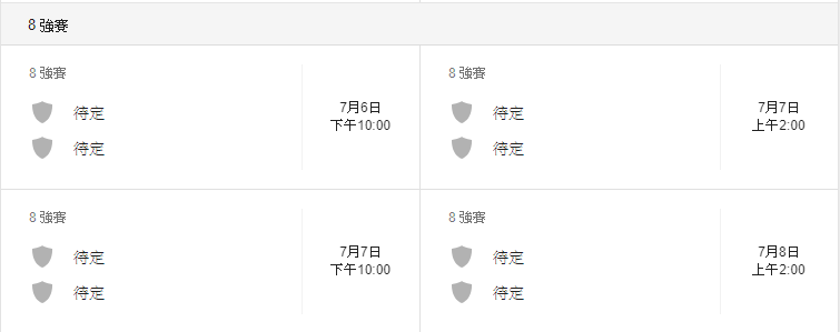 延長賽:正規時間(90分鐘)內若無法定出勝負,則加時比賽時間 30 分鐘,分為上半場及下半場各15分鐘。加時上半場結束後不會休息,直接進入加時下半場比賽。