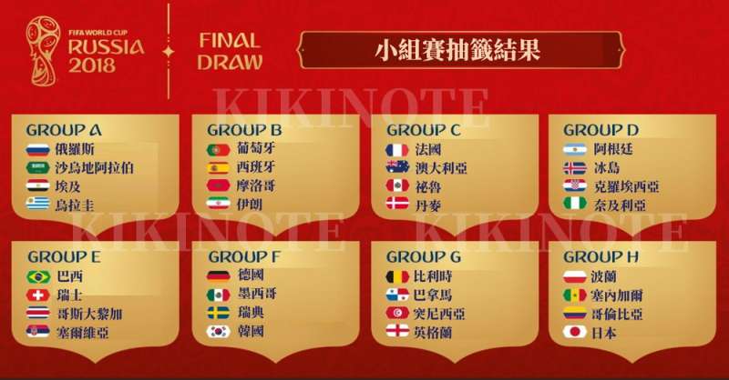 全球32支國家代表隊抽籤分成8組,從A組至H組,每組4隊,從6月14日展開競技。