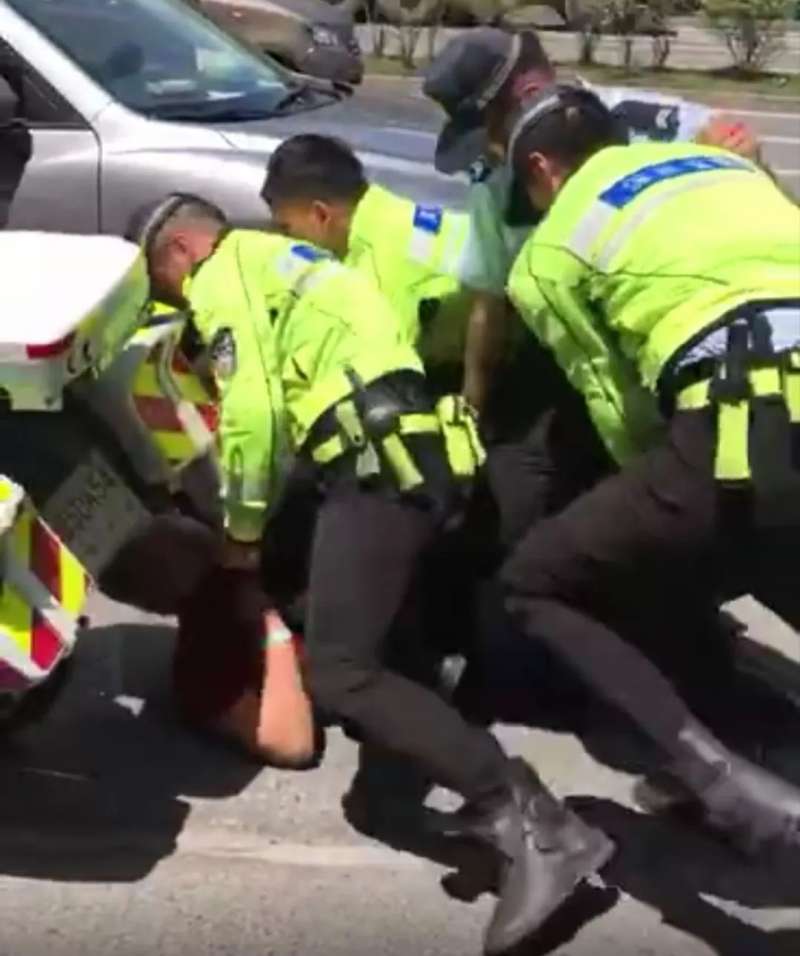▼轎車駕駛和親友多番干擾執法,情緒非常激動,還多次出手推員警。幾位員警連忙上前,想要制服他們,但駕駛還不罷休,竟然趁警方轉頭找警繩時,狠狠掐一名員警的下體。