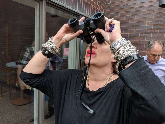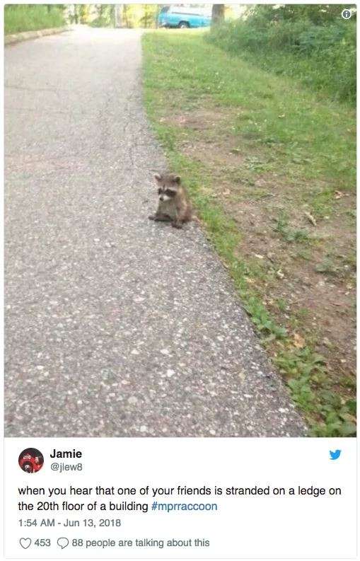▼這隻浣熊則被稱為「MPR浣熊」,因為明尼蘇達州公共廣播電台(Minnesota Public Radio,MPR)的員工最早發現牠的行蹤。這難得的一幕也吸引了許多民眾的圍觀,有人甚至拿出望遠鏡來獲取「第一手消息」。