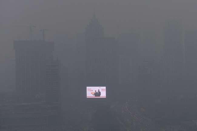 ▼6.工業的快速發展也造成了嚴重的環境污染,導致世界上85%的人口都面臨空氣污染。在北京能見度極低的霧霾天氣中,只有一個發光的廣告牌可見。