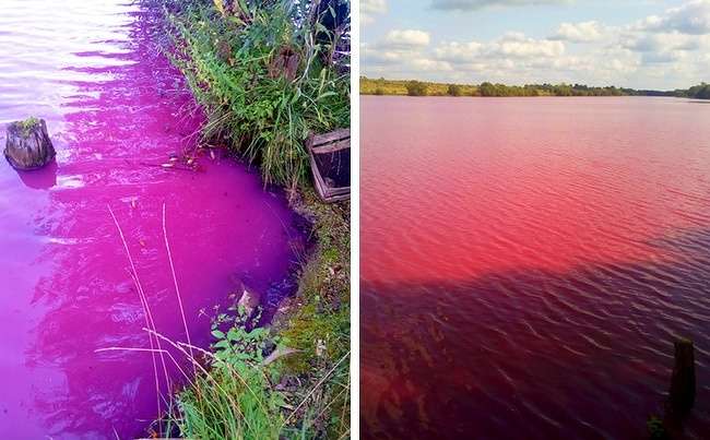 ▼8.大氣成分變化導致酸雨,進而污染土地和水庫,俄羅斯一處水庫就呈現異常的粉色。