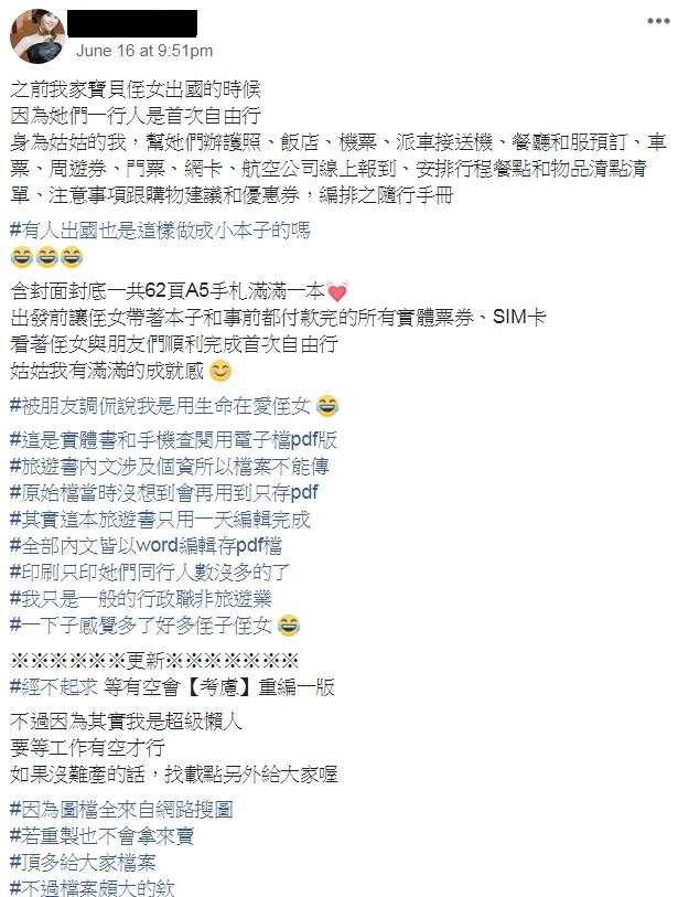 2018年06月18日日前一名女網友在臉書《爆廢公社》分享了幾張照片,原來是她的寶貝姪女要出國自由行,讓她趕緊幫忙辦護照、機票、飯店、接機服務等等,還在24小時內編排了一本A5大、62頁的「旅遊懶人包密技」,根本比外面販賣的旅遊攻略還要詳細,讓她被朋友調侃說是「用生命在愛姪女」!