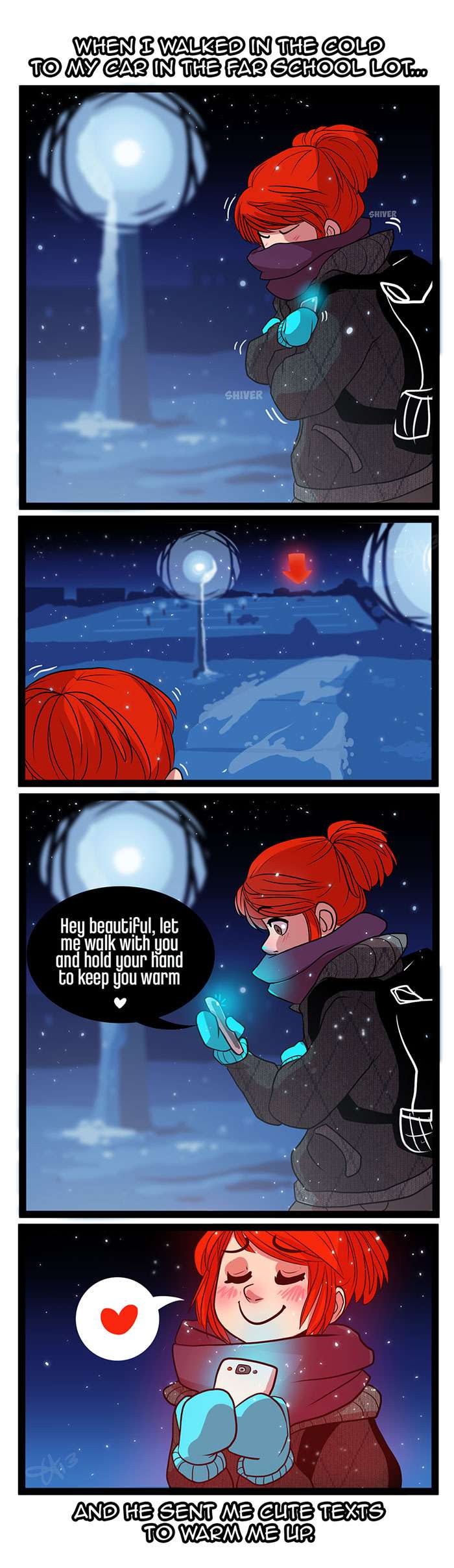 ▼「寒冷的冬天,當我一個人走去遠方的學校停車場…」「『嗨,美女!讓我和妳一起走吧,讓我牽著妳的手,給妳溫暖。』他傳來的甜蜜訊息總是能夠溫暖我的心。」