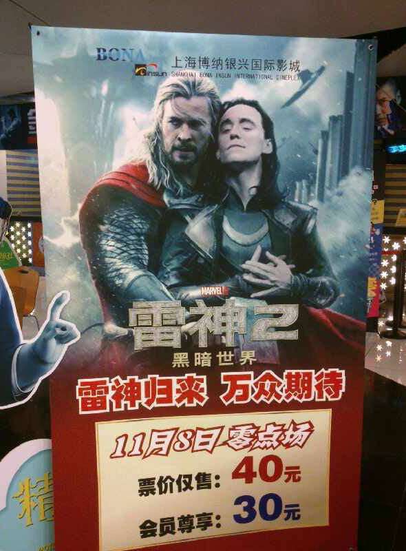 ▼這種有趣的失誤之前也發生過。《雷神索爾2》上映時,大陸一名網友PS了一張雷神洛基擁抱的基情版海報,結果被電影院直接拿去用。