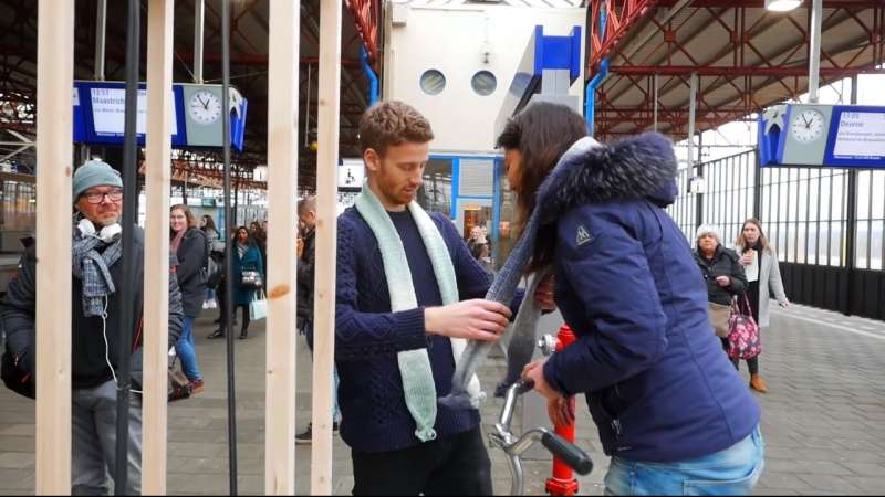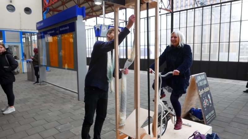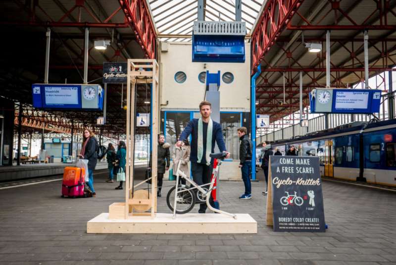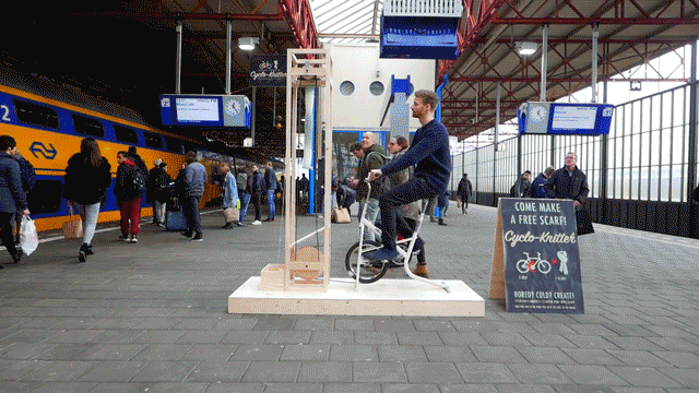 ▼這個發明叫做「Cyclo Knitter」,他將這個設計放在荷蘭的火車站內,同時本人也在一旁推廣。