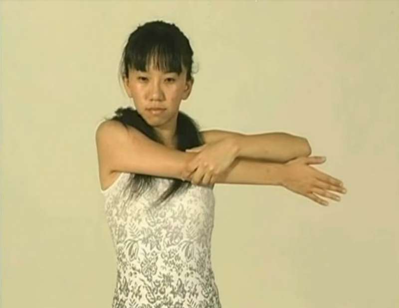 ▼再來將右手往後抬高,向左側拉動,維持一分鐘後慢慢將雙手放下。