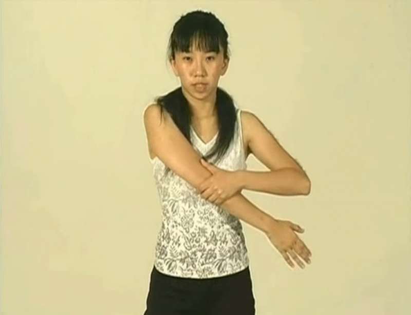 ▼首先將右手伸直並放鬆,用左手抓住右手手肘,慢慢往內壓,時間持續一分鐘。