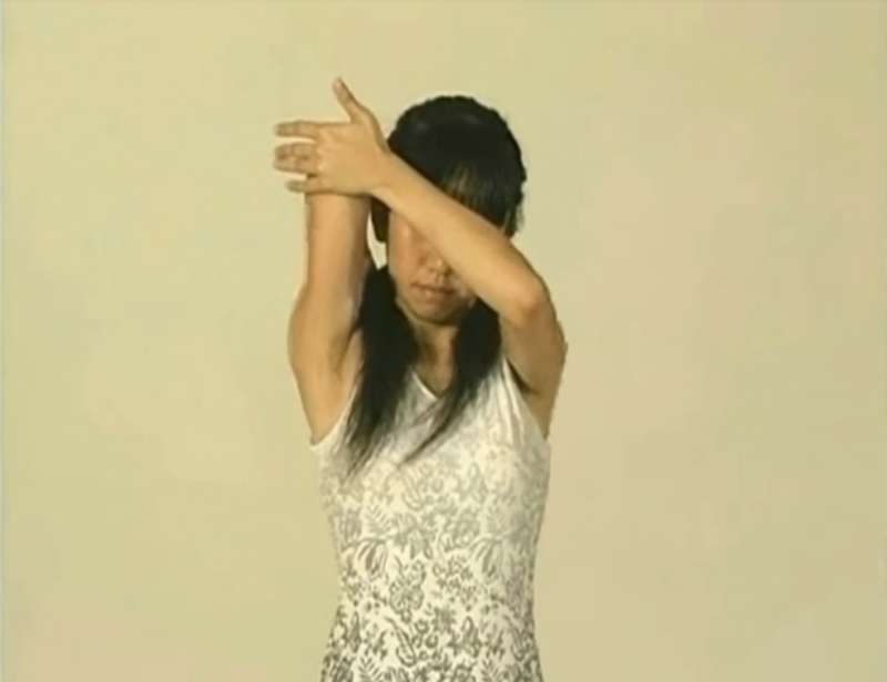 ▼跟著將右手抬高至下巴處,同樣持續一分鐘。