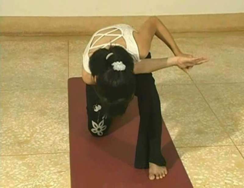 ▼最後右腳單膝跪下,用左手拉住右手拇指,右手手肘靠在左邊大腿上方,身體往前傾。