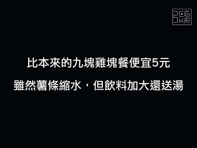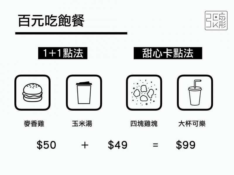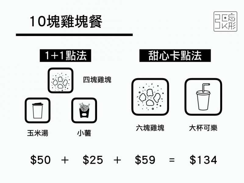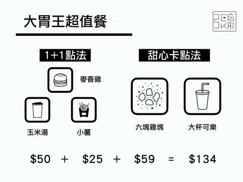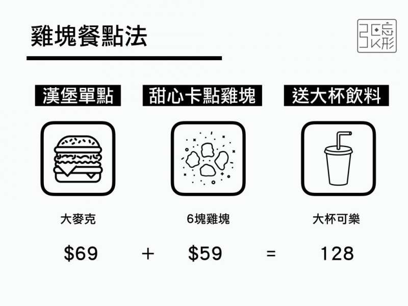 2018年06月22日喜歡吃麥當勞的人,照著麥當勞搭配好的套餐,可一點也不划算喔!溝通表達培訓師「張忘形」19日在臉書粉絲專頁分享「5種超優惠點餐攻略」,他說在麥當勞偶然聽到一對情侶的對話,女生說「麥當勞為何套餐沒有雞塊?額外加點又吃不完」,兩人便在一旁思來想去,但張忘形說,根本沒這麼難!