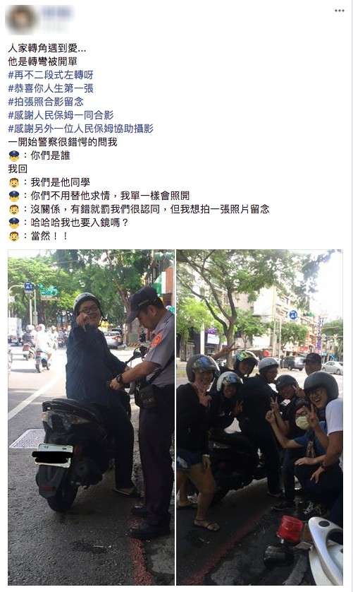 一名網友葉林勳在臉書《爆廢公社》發文,分享了友人被開單的事情,笑稱「人家是轉角遇到愛,他是轉彎被開單。」